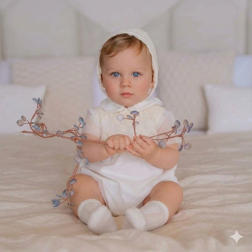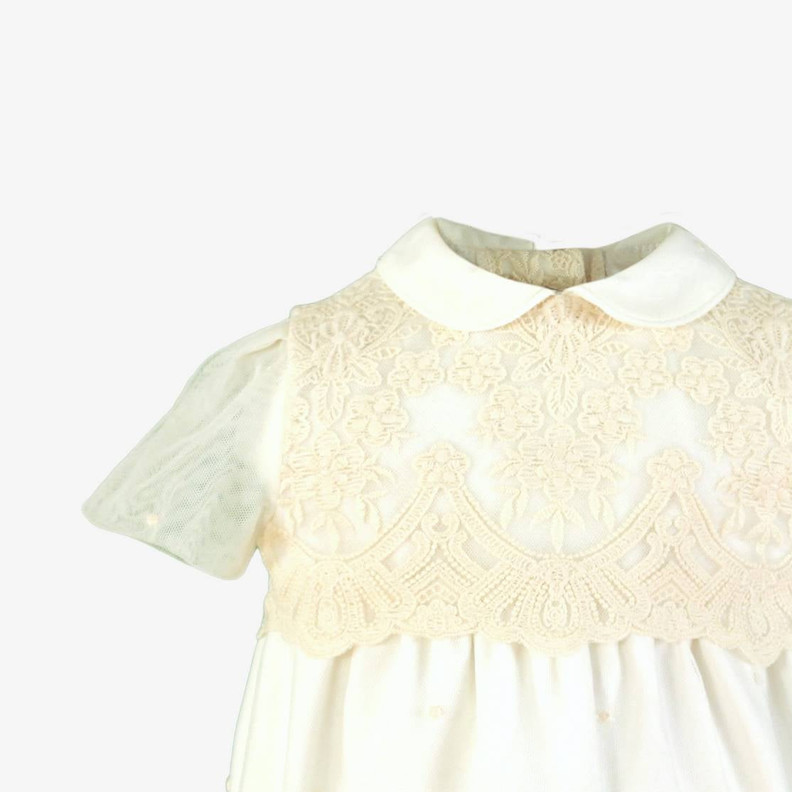 Las mangas de tul aportan ligereza y un toque romántico, mientras que el cuello bebé clásico completa un diseño dulce y atemporal. Incluye una preciosa capota con encaje a juego que convierte el conjunto en una opción perfecta para ceremonias, celebraciones o momentos inolvidables.