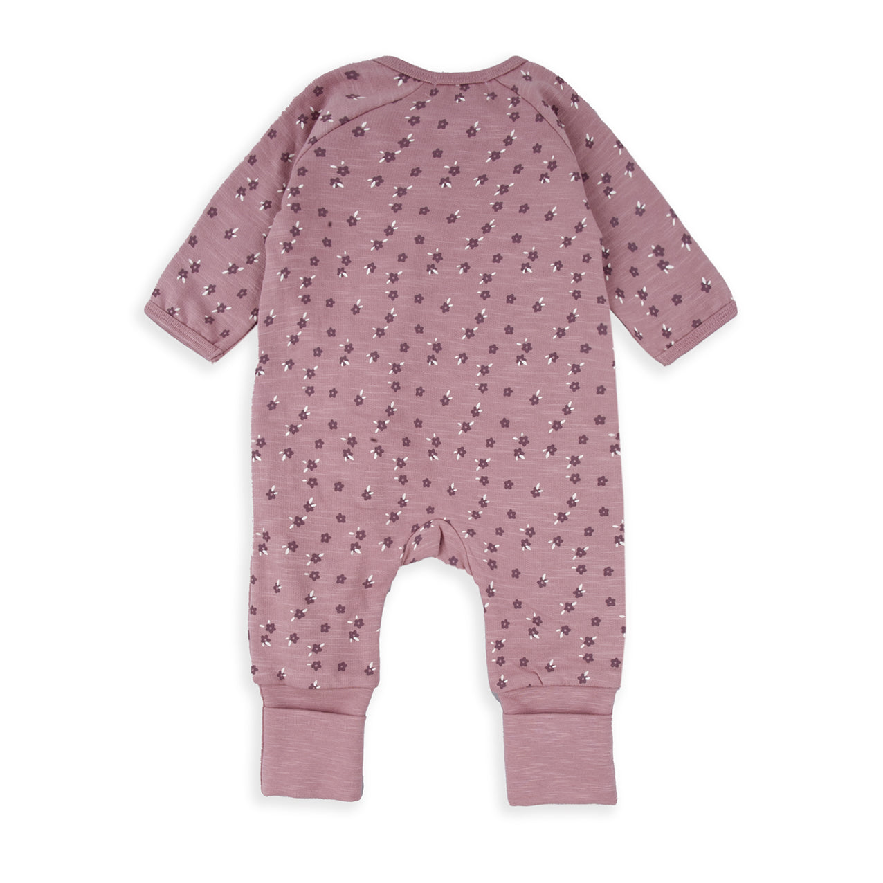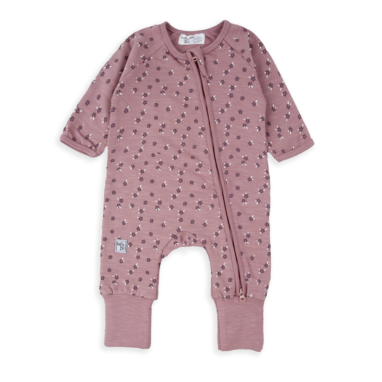 Pelele en color malva con flores muy cómodo de poner y quitar con doble cremallera. Los pies viene con patente que se puede cerrar para tener los pies calentitos.