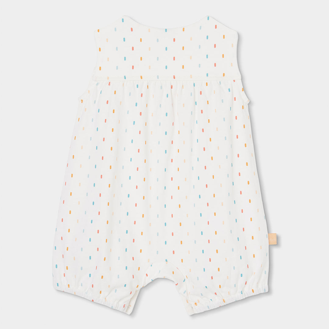 Pelele de algodón blanco , con motas tejidas en diferentes colores, para bebé. Perfecto para edades de 0 meses hasta 24 meses, ofrece suavidad y comodidad. Su diseño sin mangas y botones en los hombros facilitan su uso. Este pelele es una opción práctica y encantadora para mantener a tu bebé cómodo y a la moda.