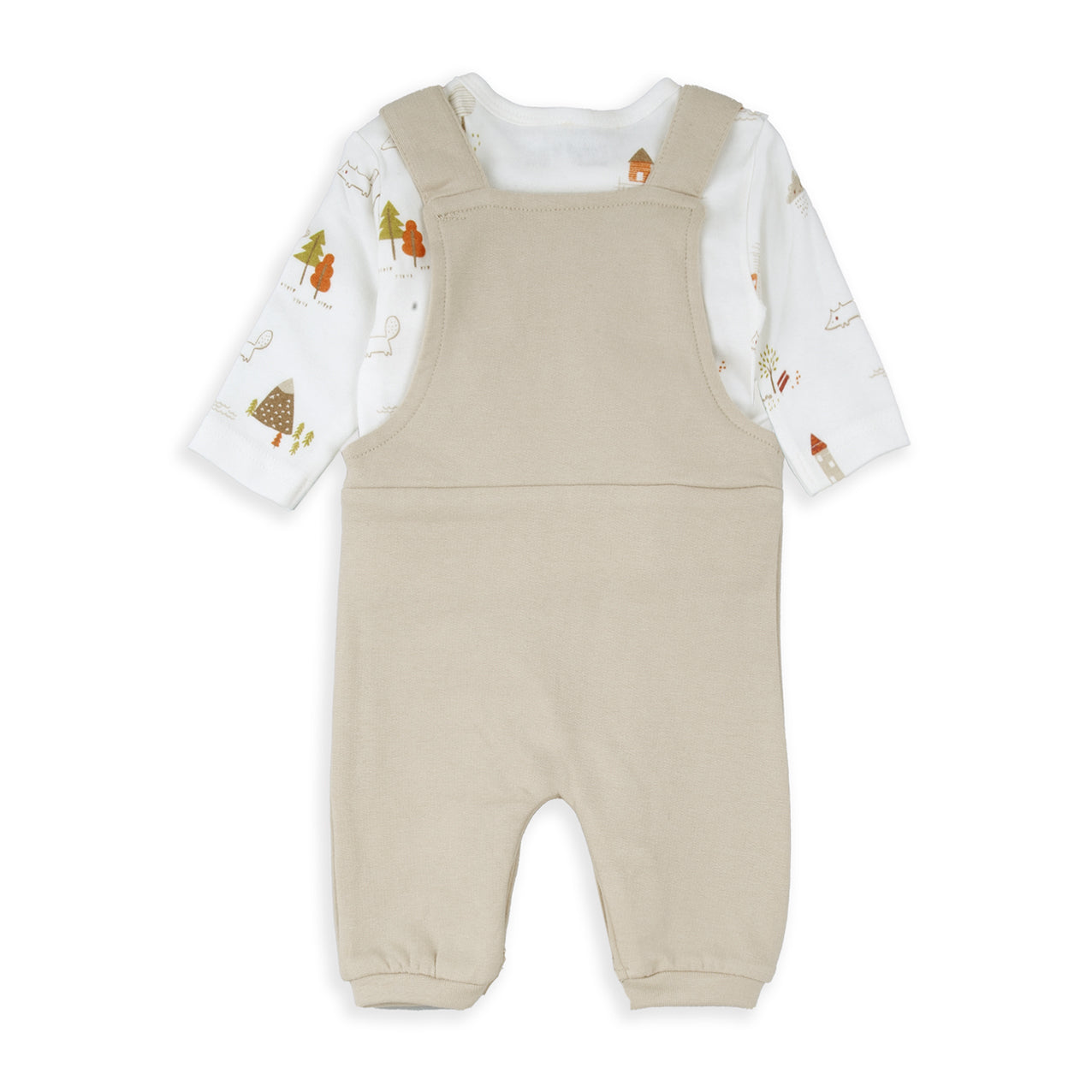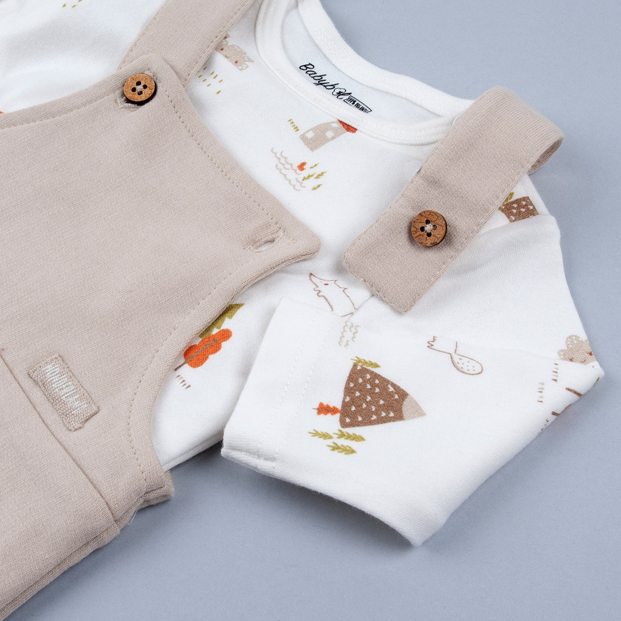 Peto beige con camiseta blanca con motivos de zoriitos.