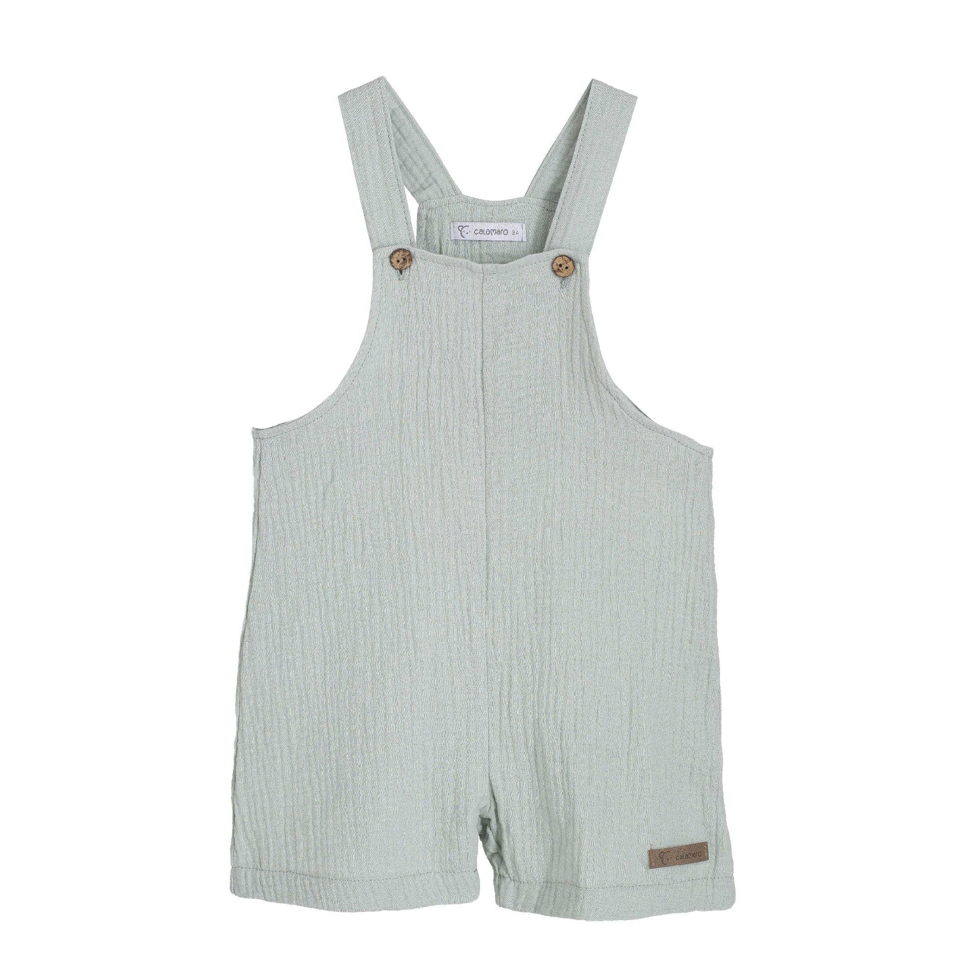 Confeccionado en suave tejido de algodón en tono verde agua, destaca por su diseño sencillo y natural. Los tirantes con botones de madera aportan un detalle delicado y permiten un ajuste práctico.