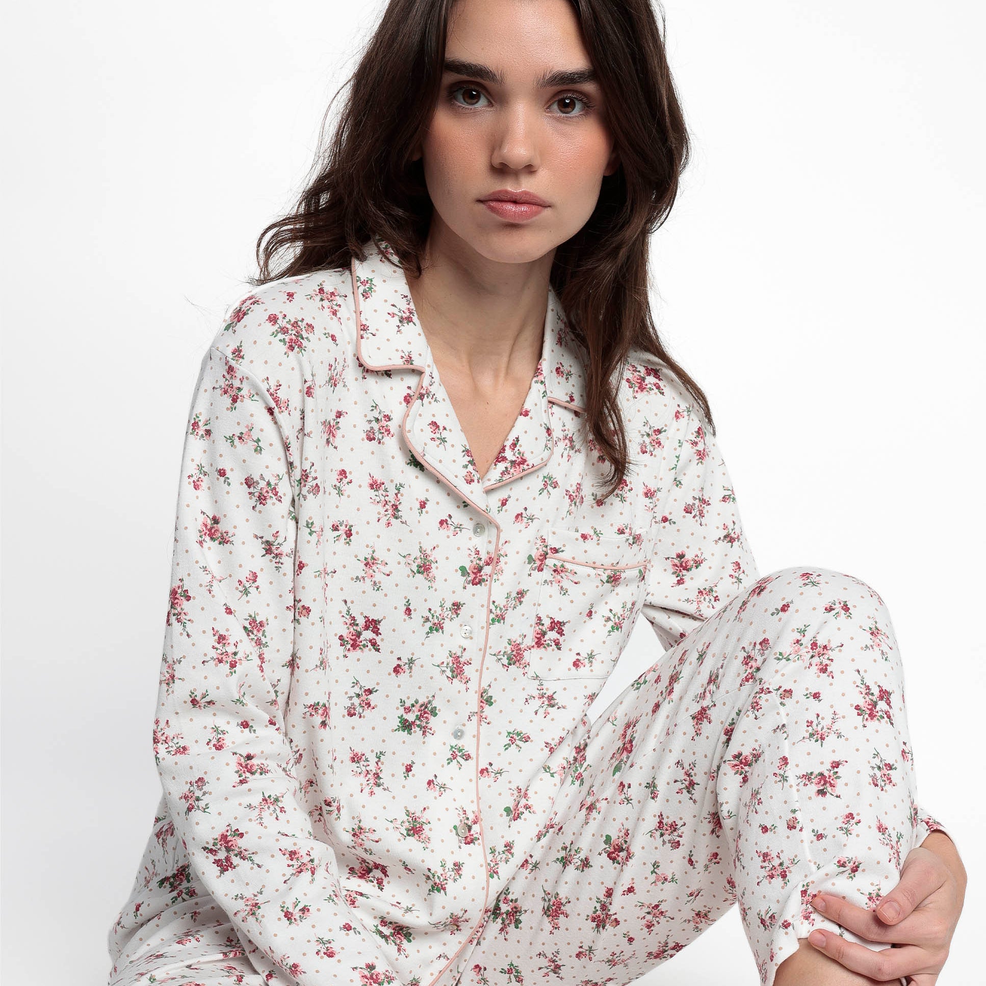 Pijama abierto de punto de algodón, de manga larga, cuello de solapa y pantalón largo.