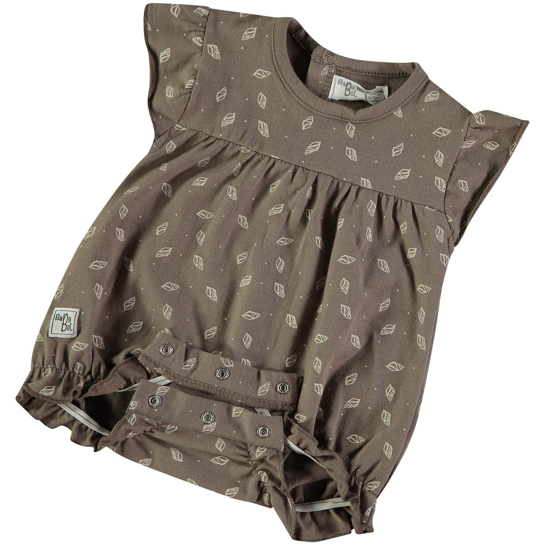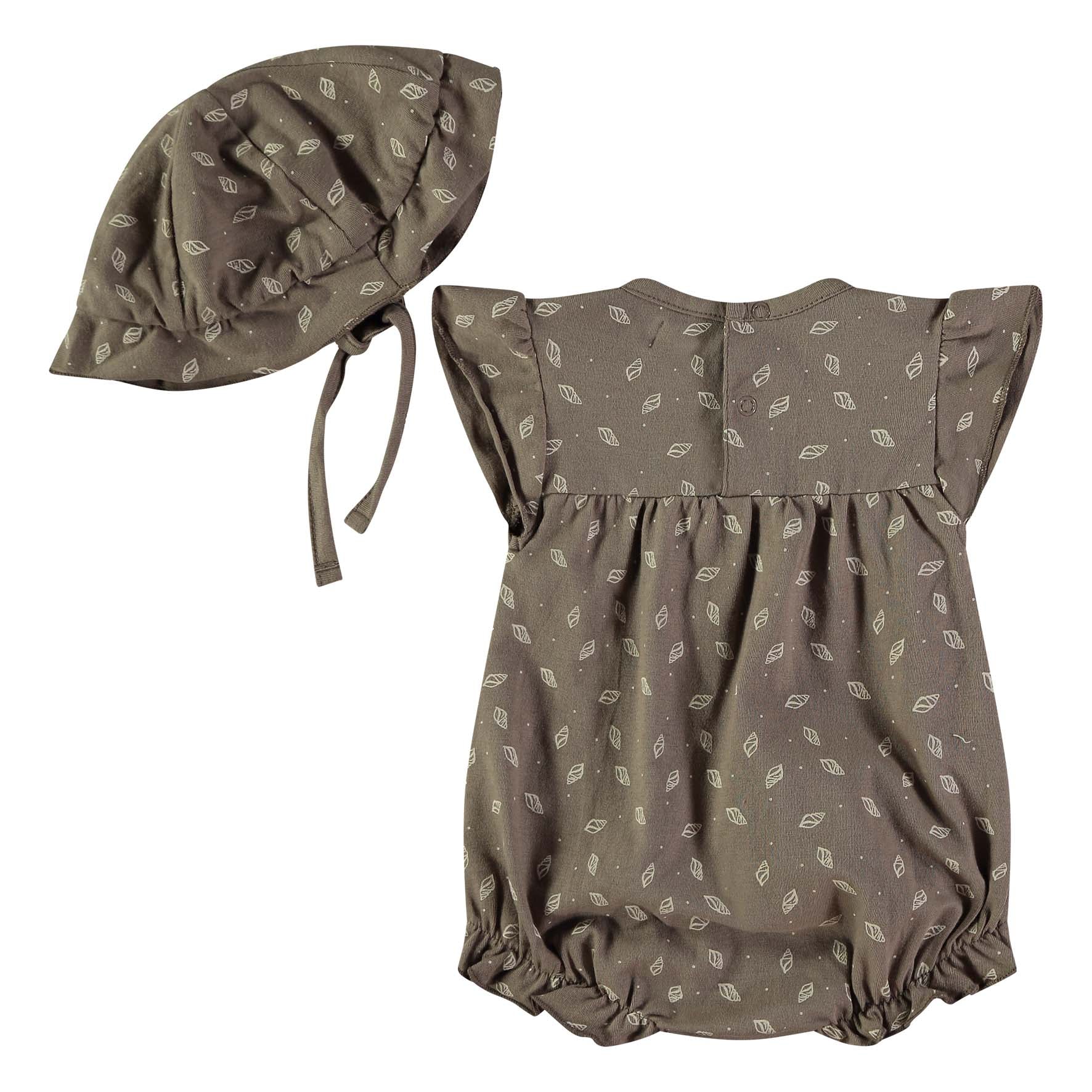 Este conjunto de dos piezas incluye una ranita con volante en los hombros y un gorrito a juego, ambos con un delicado estampado de hojitas que aporta un estilo dulce y atemporal.