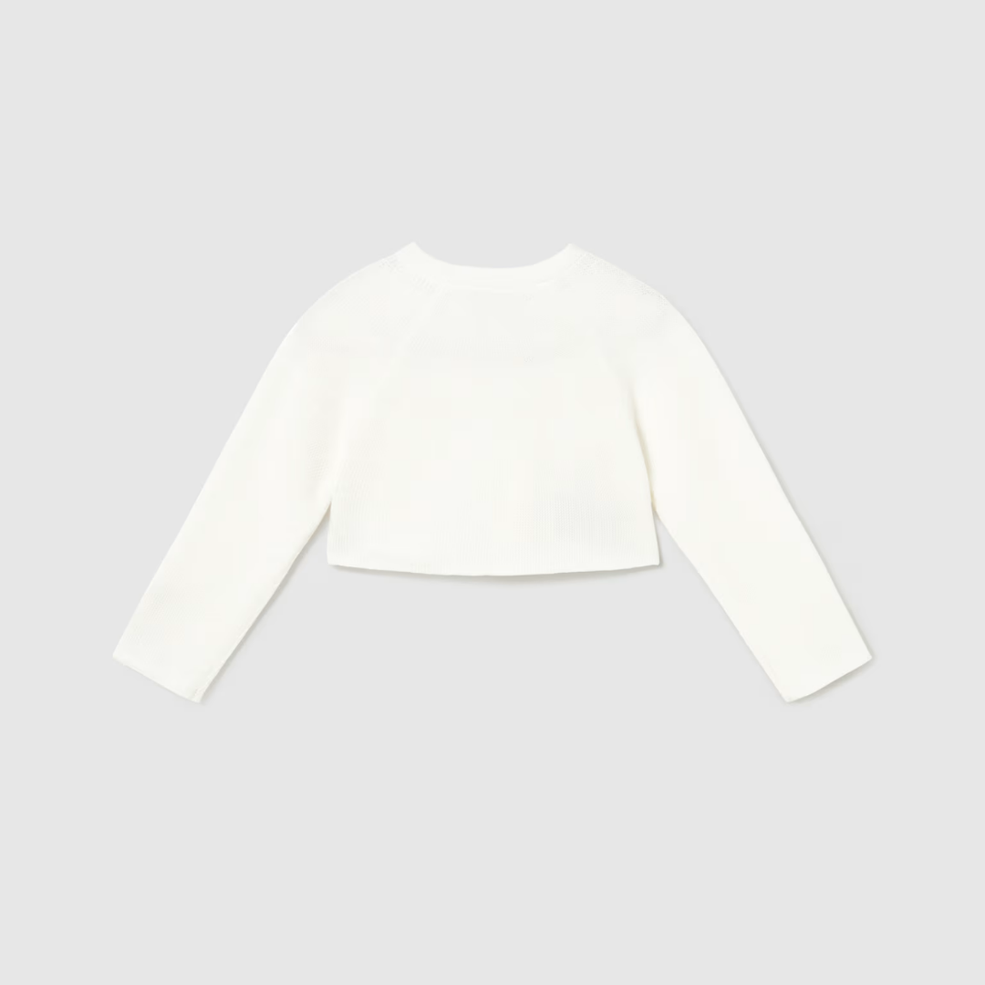 Una rebeca delicada y elegante, perfecta para completar los looks de los más pequeños. Su diseño de cuello redondo y punto tricot aporta un estilo clásico y atemporal que nunca pasa de moda.