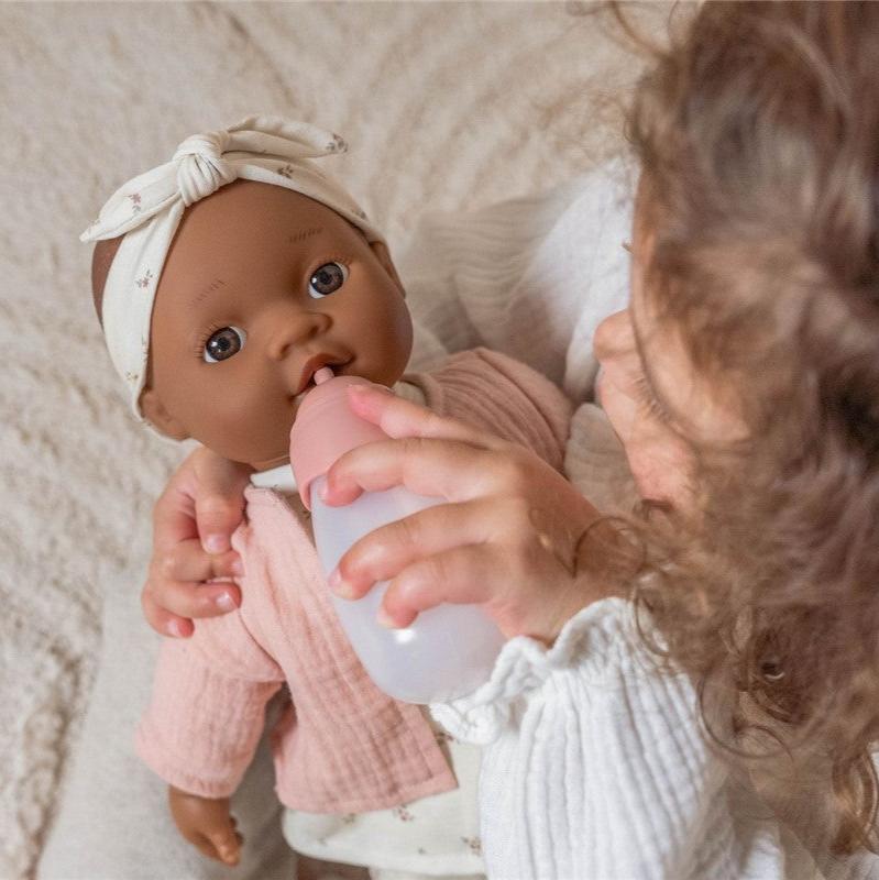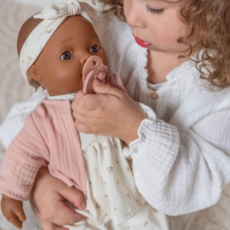 Conoce a la bebé Noa. Dale un abrazo y cuídala. Noa es una muñeca adorable y realista, con un cuerpo suave y mimoso, a la que le encanta que la quieran. Puedes cambiarle de ropa, ayudarla a dormir y calmarla con el chupete. Cuando tenga hambre, ofrécele el biberón de leche. A los niños les encanta imitar todo lo que hacen sus padres, y esta muñeca inspirará a su pequeño a participar en juegos de roles de crianza y cuidado. Noa está vestida con una diadema, un vestido y pantalones del diseño White Meadows, con un chaleco rosa suave. Cambiarle de ropa promueve la motricidad fina, y el chupete y el biberón añaden un elemento de juego interactivo..