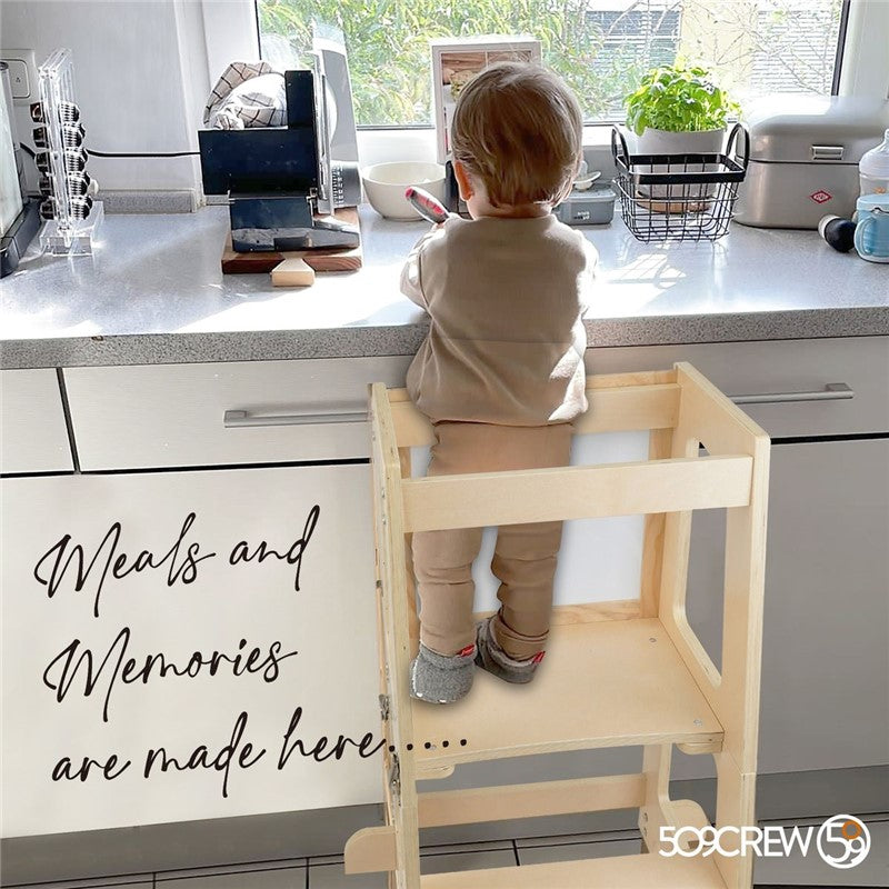 Tiene la altura justa para la mayoría de encimeras de las cocinas y de los muebles de lavabo de los cuartos de baño. Cuenta con un peldaño de seguridad ajustable en altura a 16,5 cm o 22,5 cm del suelo. La patas traseras tienen unos extensores para aumentar la estabilidad. Contiene una pizarra con doble funcionalidad, por un lado es magnética para escribir con rotuladores y utilizar juguetes magnéticos y por el otro pizarra tradicional de tiza. Contiene libro de instrucciones, el montaje es sencillo, contiene llave Alen. Tiene dos cierres metálicos para convertir la Torre de Aprendizaje en escritorio. Ideal para desarrollar habilidades manipulativas, destreza al tocar y agarrar. Desarrolla la coordinación mano-ojo, esta torre es la compañera perfecta para explorar el mundo.