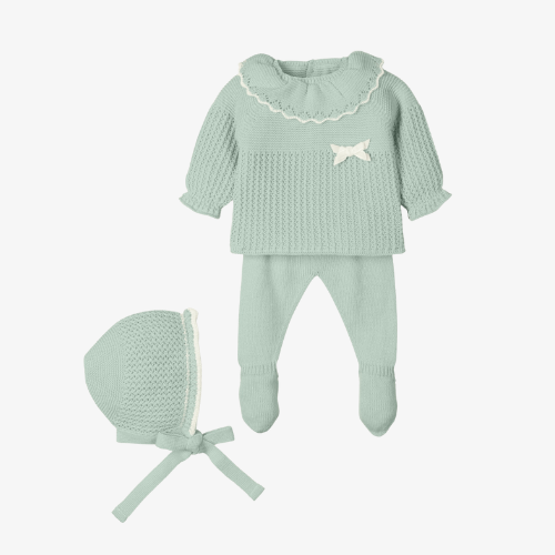 Conjunto de gorro, jersey y polaina modelo sueño empoñvado en color verde agua. Ideal para un detallito presentado en una tierna y delicada caja de regalo.