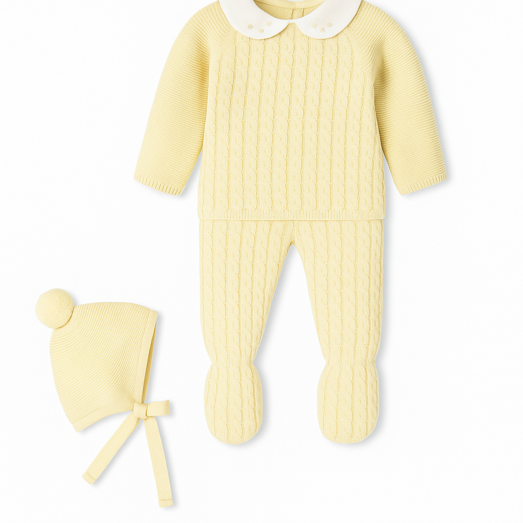 Conjunto de gorro, jersey y polaina modelo Cloud Braide en color amarillo. Ideal para un detallito presentado en una tierna y delicada caja de regalo.