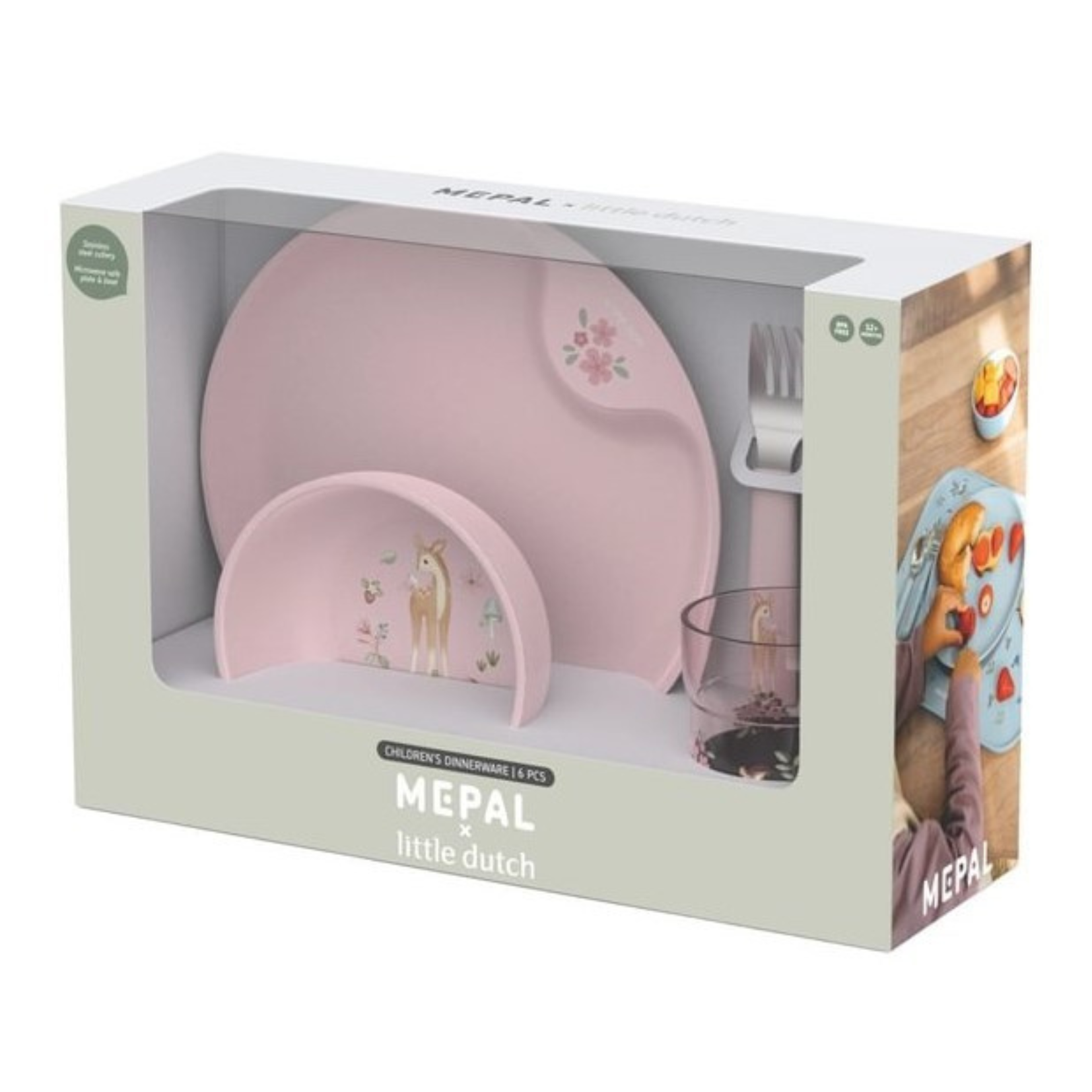 Vajilla infantil de 6 piezas de la colección Mio de Mepal para Little Dutch. Esta bonita vajilla además de tener un bonito diseño es perfecta para ser la primera vajilla del peque. Consta de 6 piezas: un plato, un vaso, 3 cubiertos y un bol. Es ideal para regalar e introducir a los peques la hora de comer como algo divertido