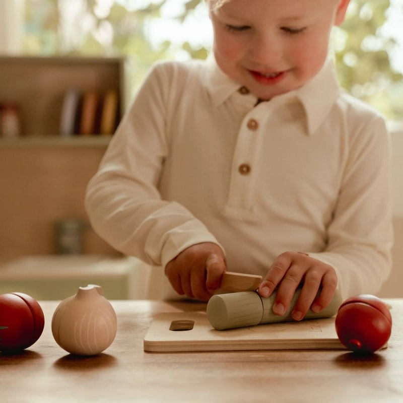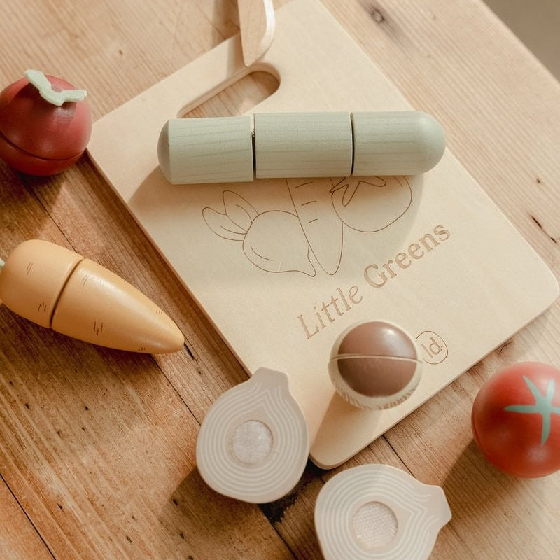 ¡Es hora de preparar platos saludables de verduras! Este juego de madera para cortar verduras incluye seis tipos diferentes: zanahoria, pepino, tomate, cebolla, remolacha y champiñón. Córtalos por la mitad con el cuchillo de madera y luego pégalos fácilmente con el velcro. Perfecto para jugar a la cocina y una forma divertida de aprender sobre alimentación saludable. ¿Qué hay en el menú de hoy?