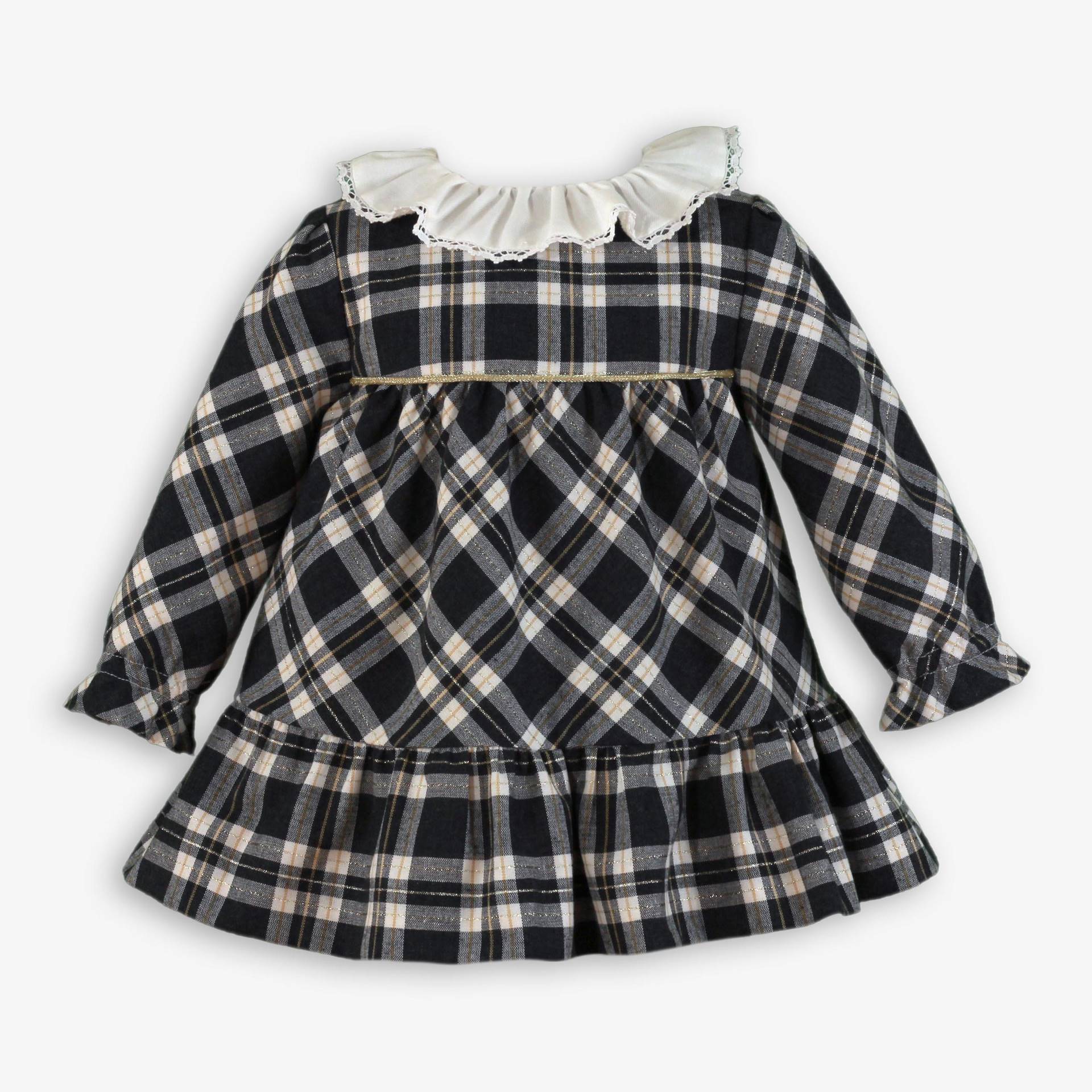 Espectacular vestido de manga larga para niña de la marca Miranda. Esta confeccionado en tejido estampado de cuadros en tonos gris marengo y blanco. Es de corte alto y lleva volante en el bajo. La parte central dela falda lleva colocado el mismo cuadro de forma transversal, de manera que crea un efecto visual muy especial.