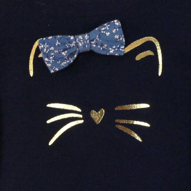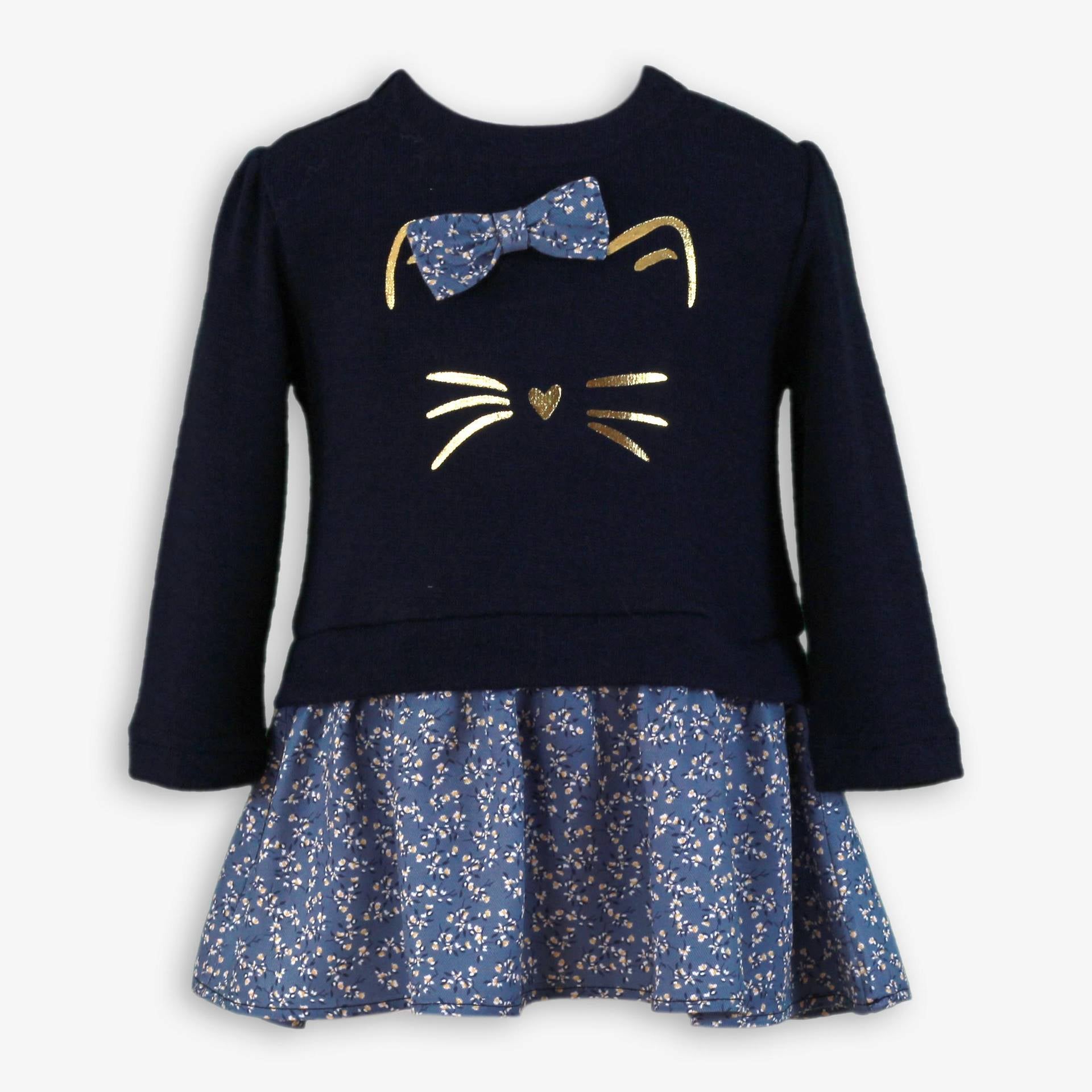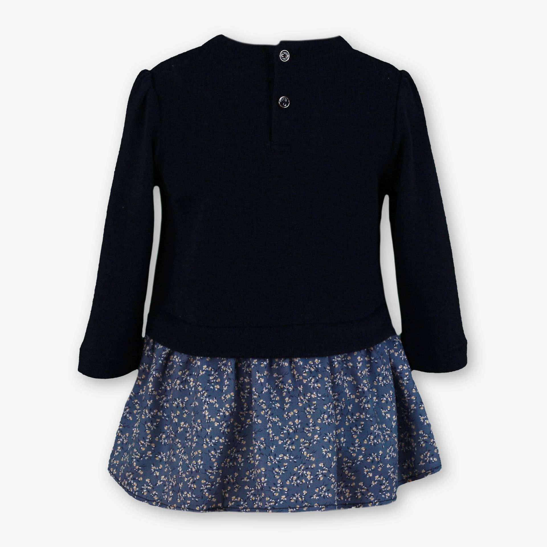 Exquisito vestido de manga larga para bebe niña de la marca Miranda. Simula que el vestido fuesen 2 piezas, con la falda de color azulón estampada de flores blancas y el cuerpo es tipo sudadera de color marino con el cuello redondo y serigrafiado en el delantero con silueta de gatito en color dorado y lazada de la misma tela de la falda en el delantero.