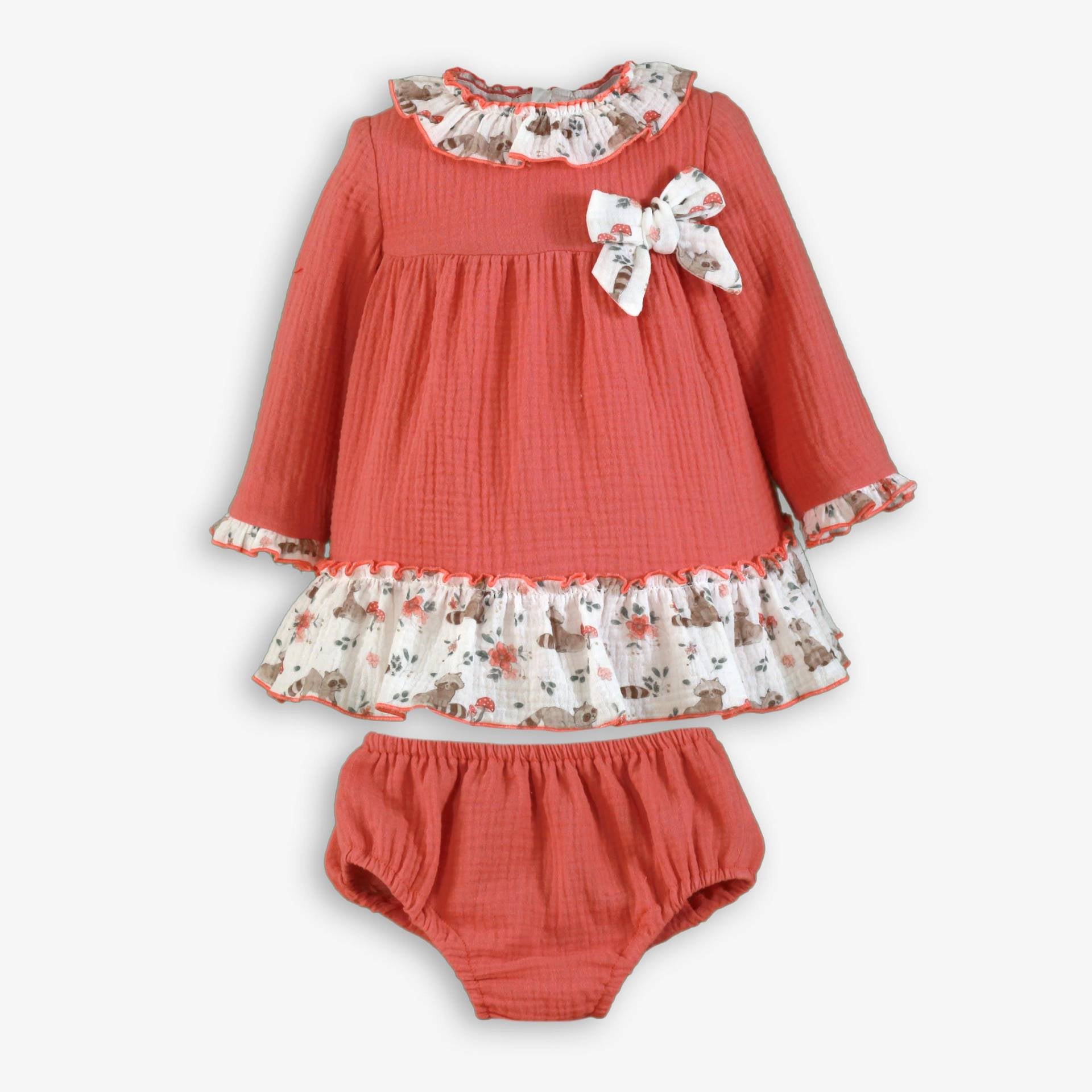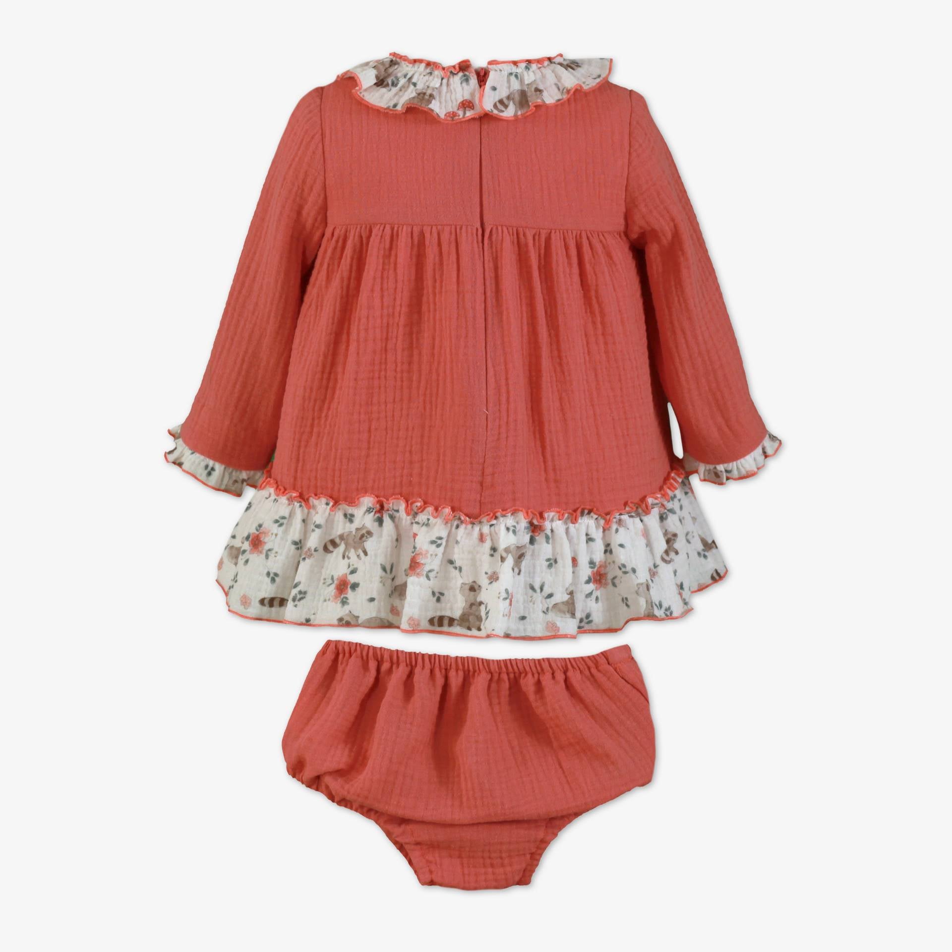 Fabuloso vestido de manga larga para bebe niña de la marca Miranda. Esta confeccionado en color salmón, estampado de graciosos mapaches y flores con su braguita a juego. Es de corte alto y luce 2 bolsillos funcionales de plastrón con volante de cuadro vichy gris en el delantero y cuello de solapa con el mismo volante que los bolsillos. Cierra en el delantero con botonadura vista de 6 botones.