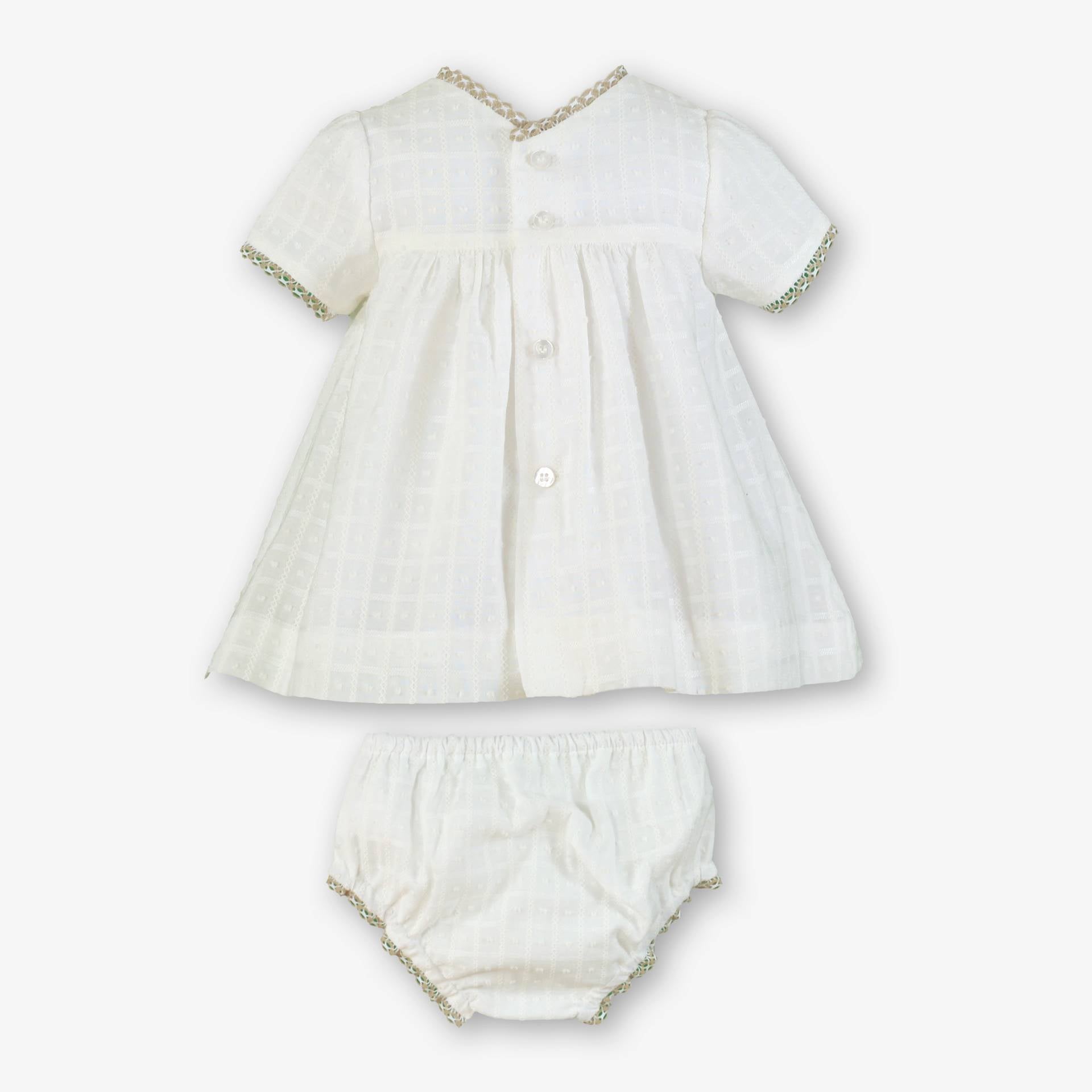 Su falda con ligero vuelo crea un diseño cómodo y favorecedor, ideal para ocasiones especiales o para vestir al bebé con un estilo refinado. Incluye braguita a juego para completar el conjunto con armonía.