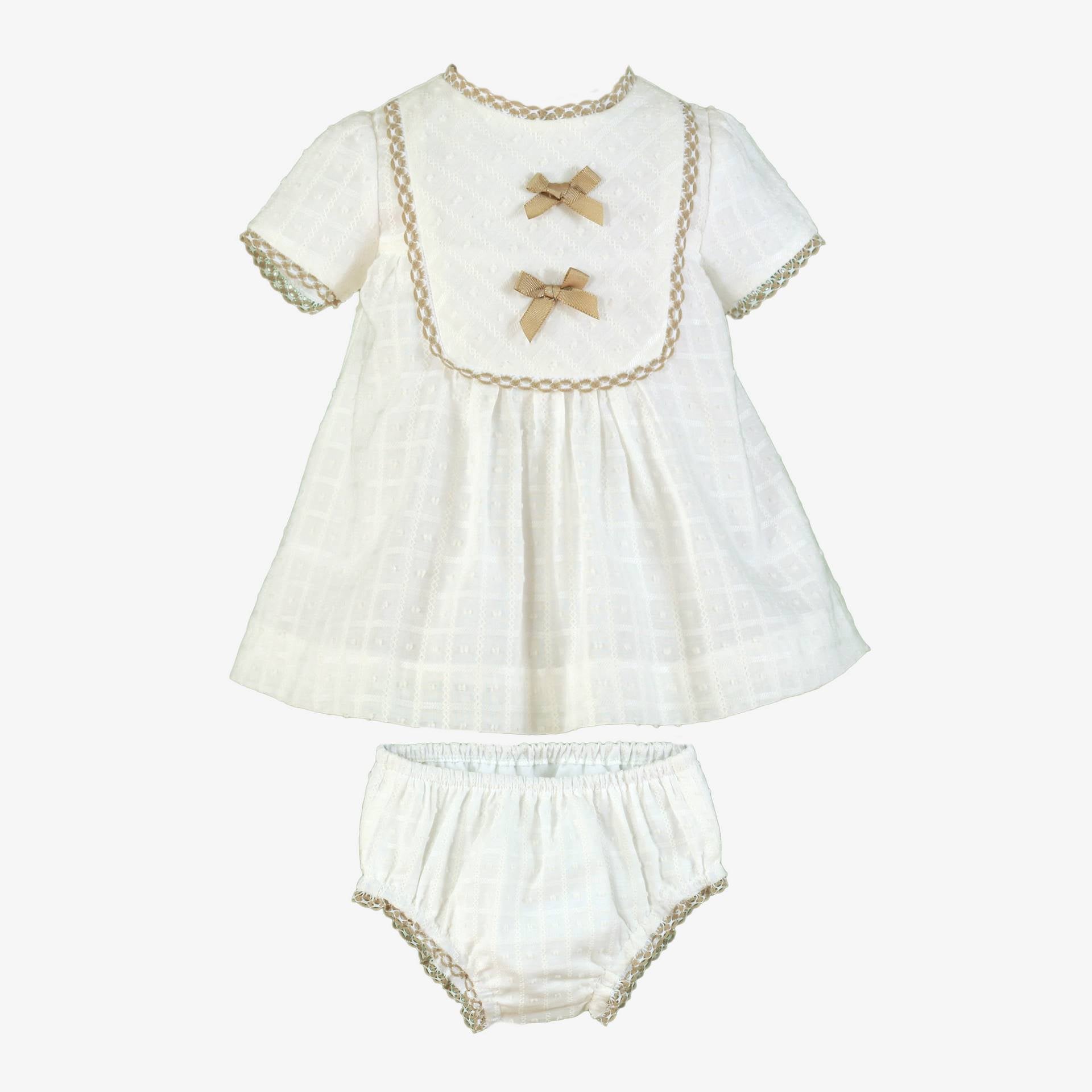 Un conjunto delicado y elegante pensado para los primeros looks del bebé. Este vestido en tono crudo destaca por su tejido con textura y su precioso canesú decorado con puntilla y pequeños lazos en color beige, que aportan un toque clásico y muy dulce.