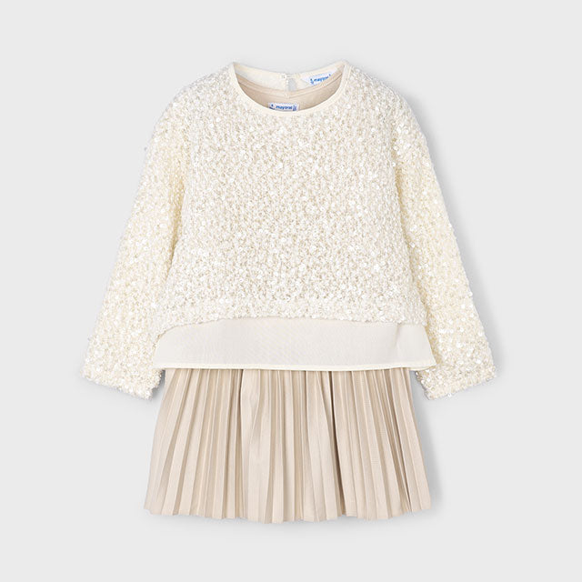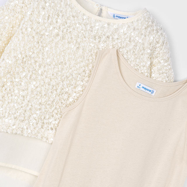 Blusa de manga larga para niña. Cuello redondo. Diseño simulado con prendas en superposición. Abertura con botón en el cuello para facilitar la puesta de la prenda. Elementos de adorno: lentejuelas.