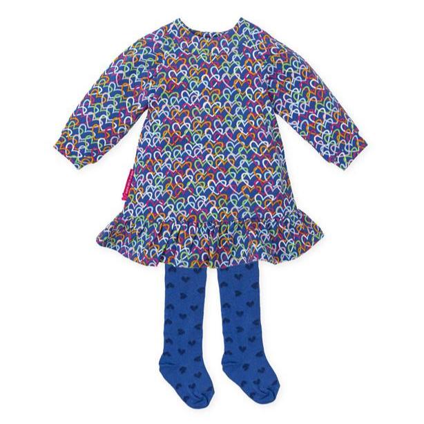 Bonito vestido azul con detalles multicolor de la colección Glitter. Leotardos incluidos.