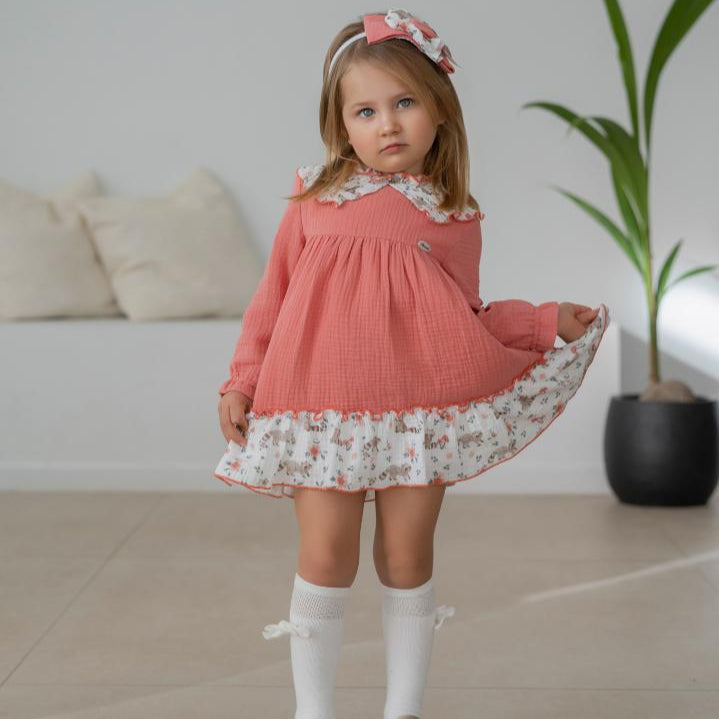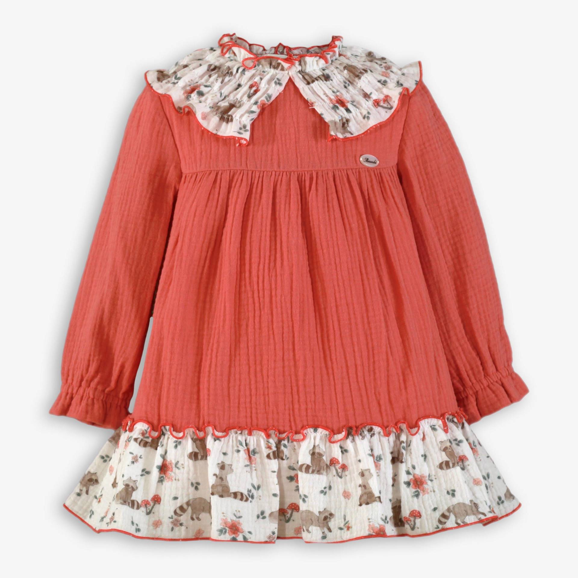 Hermoso vestido de manga larga para niña de la marca Miranda. Es de corte alto con drapeado en el corte, y esta confeccionado integramente en tejido de color salmón, aunque lleva un volante en el bajo de color blanco con estampado de mapaches ribeteado con hilo salmón, que también aparece en el cuello en forma de volante, detalles que le hacen muy vistoso. Cierra en la espalda.