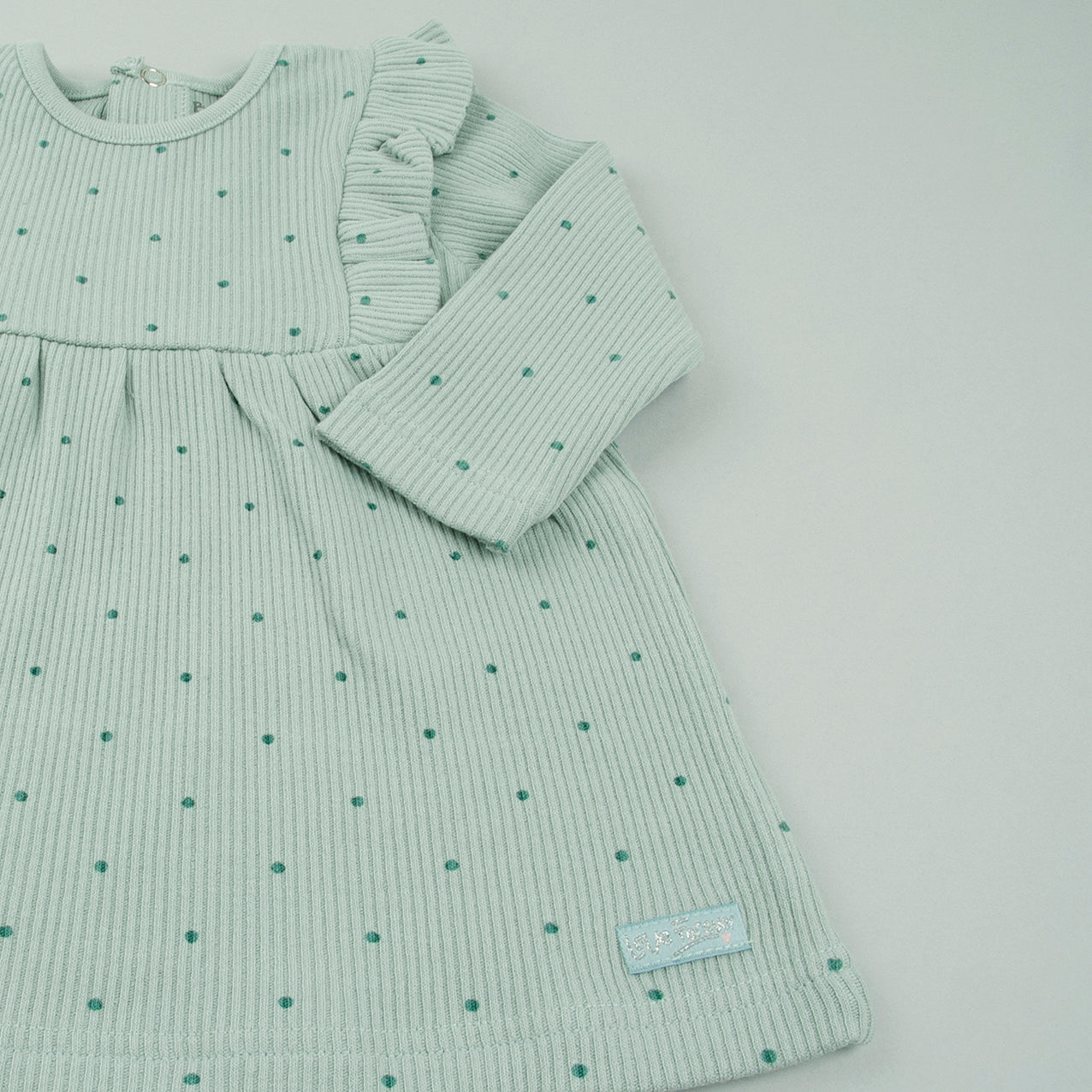 Vestido de punto verde agua con lunares verdes y volantes en los hombros.