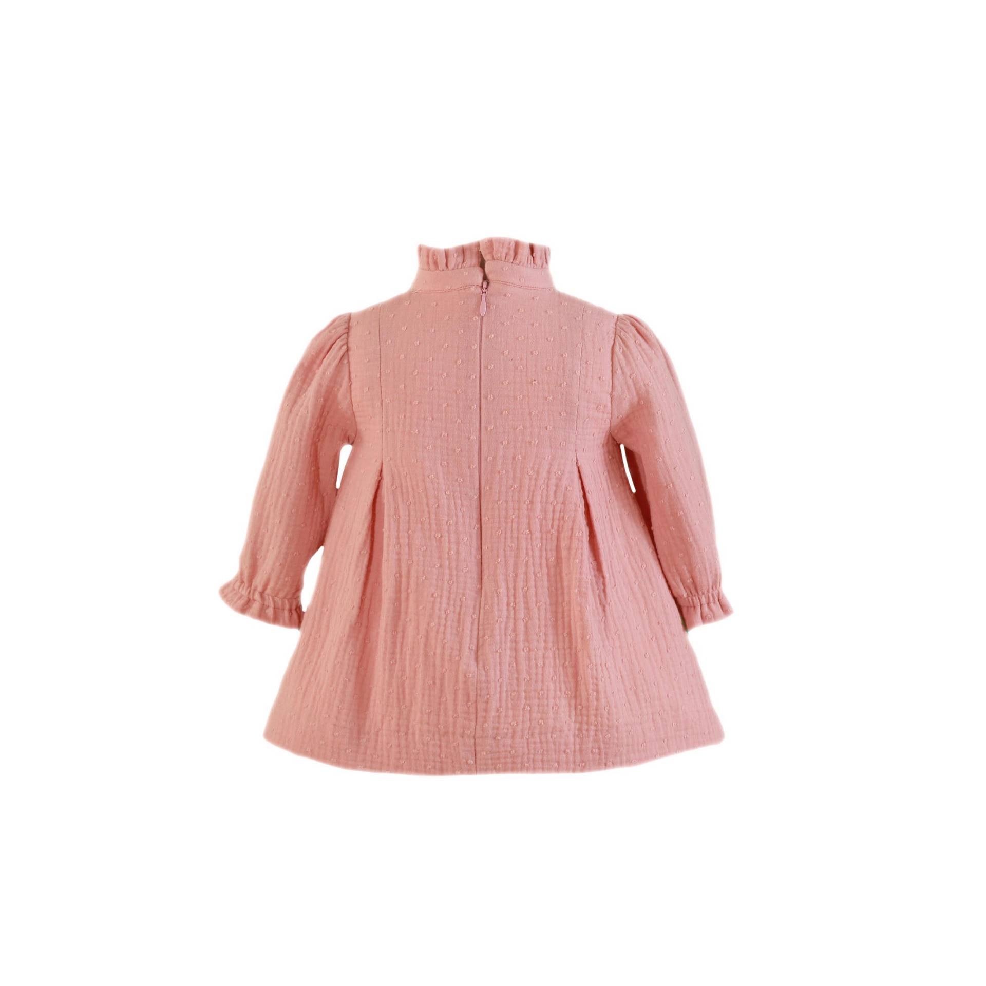 Atractivo vestido de manga larga para niña de la marca Miranda. Esta confeccionado en color rosa palo y tiene corte en la cintura, donde luce una cinturilla ancha de la misma tela con doble volante y va ligeramente drapeado para dar volumen a la falda. Se adorna con volantes de la misma tela en los hombros, y el cuello es redondo, también con volante.