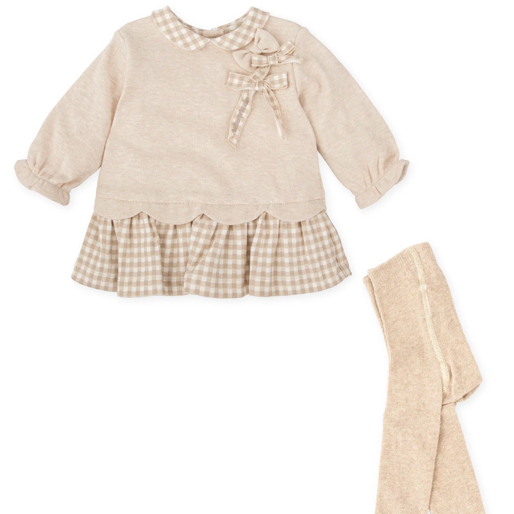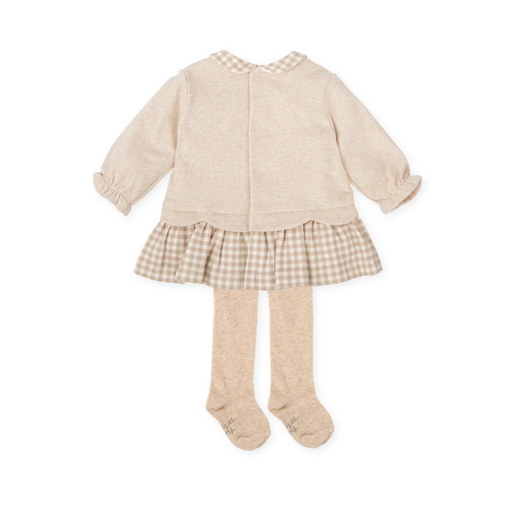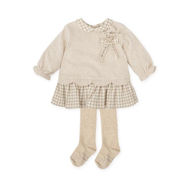 Vestido está combinado liso color arena y cuadritos, detalle ondas, suave goma en los puños y abertura trasera con botones a presión. Combina con leotardos en color arena.
